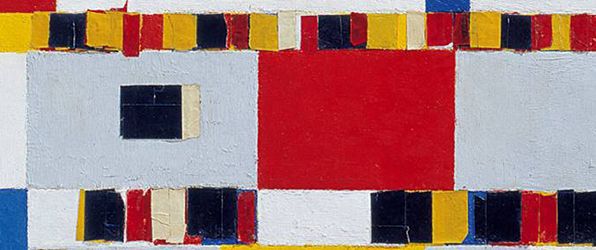 In the 1920s, Mondrian began to create the abstract paintings for which he is best known. He limited his palette to white, black, gray, and the three primary colors, with the composition constructed from thick, black horizontal and vertical lines that delineated the outlines of the various rectangles of color or reserve. The simplification of the pictorial elements was essential for Mondrian's creation of a new abstract art, distinct from Cubism and Futurism. The assorted blocks of color and lines of differing width create rhythms that ebb and flow across the surface of the canvas, echoing the varied rhythm of modern life. The composition is asymmetrical, as in all of his mature paintings, with one large dominant block of color, here red, balanced by distribution of the smaller blocks of yellow, blue, grey, and white around it. This style has been quoted by many artists and designers in all aspects of culture since the 1920s.