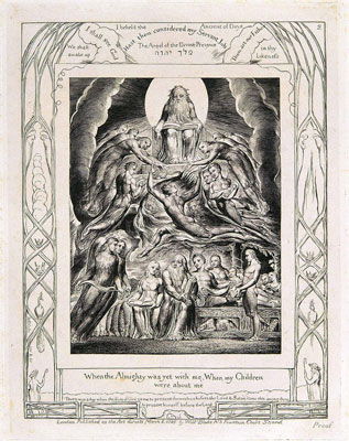 This engraving depicts the Old Testament character of Job surrounded by his children, while Satan sits above him in heaven, in front of a large sun, encircled by angels. The scene is an illustration of Job 29.5, which is written below the plate: "When the Almighty was yet with me, When my Children were about me". Satan Before the Throne of God is one of 22 engraved prints created towards the end of Blake's life, known as the Illustrations of the Book of Job. In the passage above, God has allowed Satan to kill Job's family and take away his wealth in order to test his faith. Though his relationship with God ultimately endures, at this point Job is lamenting his lost happiness, and questioning the creator's wisdom.