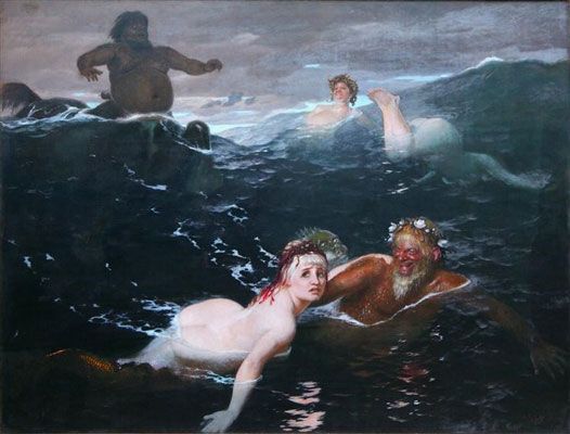 Another painting which had achieved great fame by the time of Böcklin's death, Playing in the Waves shows the artist's irreverent approach to his classical sources. The figures in the waves seem to be modelled on Triton, the sea-god and merman of Greek mythology, but there is no mythical base for the scene depicted. Instead, the painting recalls an incident witnessed by Böcklin during a holiday on the Italian coast, when his friend, the zoologist Anton Dohrn, surprised a group of women bathers, approaching them underwater and suddenly resurfacing. It is even said that the face of the Triton, whose salacious intentions seem clear, is based on Dohrn's.