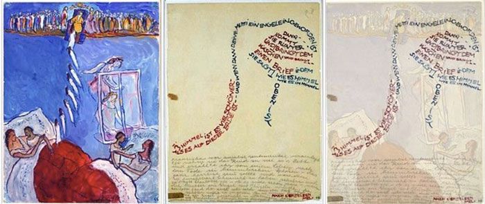 The memory becomes a dreamy scene that floats upon a swirling blue background. The space is clearly divided in three parts. In the first part, on the bottom left, Charlotte and her mother are shown talking to each other in a large bed with a deep red cover. The daughter is embraced tenderly by her mother. Next, Franziska appears in the center of the page floating upward, with the image of her body repeated in sequence along the ascending line toward the rendition of Heaven at the top of the page. Heaven is painted as a gathering of individuals spread horizontally across the top of the page, with God at the center greeting Franziska at an open doorway. In the final part in the lower right of the page, Franziska appears as an angel to deliver a letter through the window to her daughter. Below the window is an image of Charlotte leaning over her mother in another bed, perhaps her mother's deathbed, something that the artist herself would never have experienced in real life.