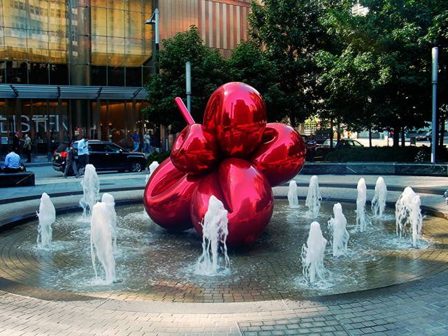 Koons created his Balloon Flower (Red) as a memorial to those who survived 9/11. It exhibits the highly polished style that can be found in several of his sculptures. Its bright color and shiny surface make it feel distinctly upbeat, a celebration of moving forwards as well as looking back. Its resemblance to a giant balloon confuses the viewer’s eye; you almost expect it to start floating up into the air.