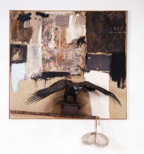 Robert Rauschenberg's <i>Canyon</i> (1959) with its eerie bird perched in front of the collage, making the two-dimensional work becomes three-dimensional.